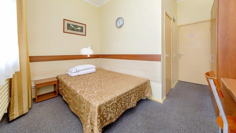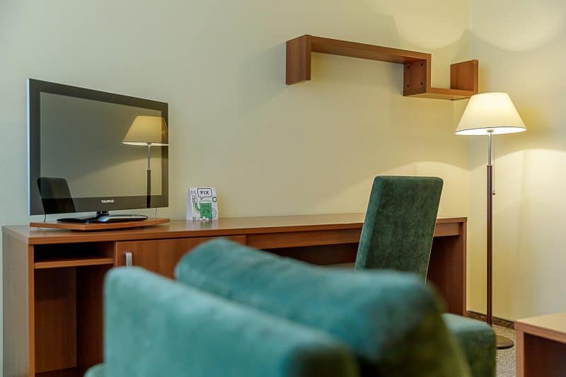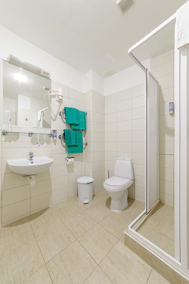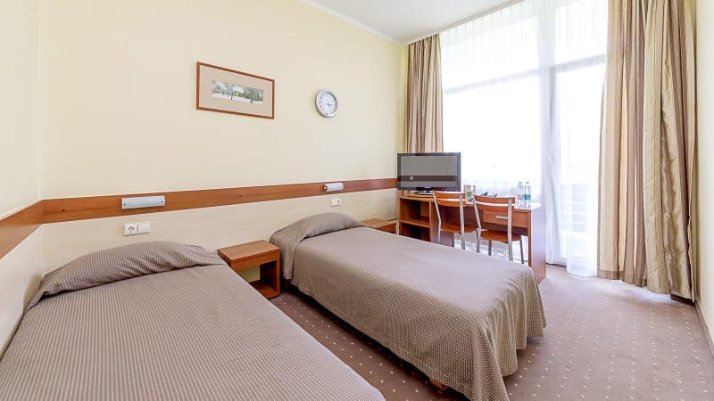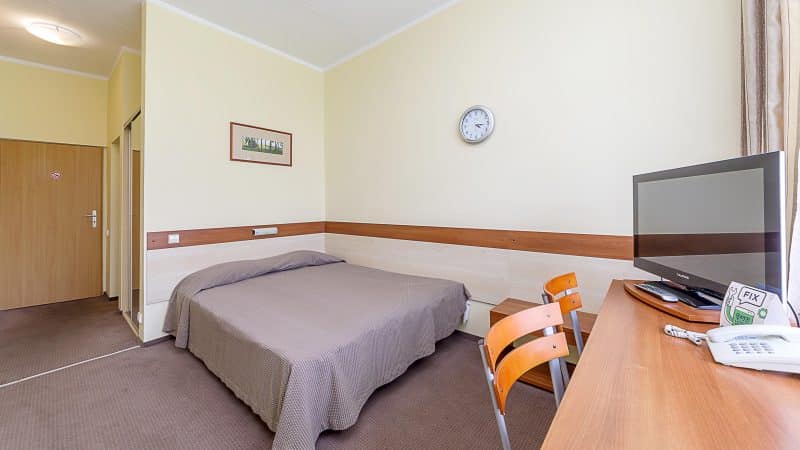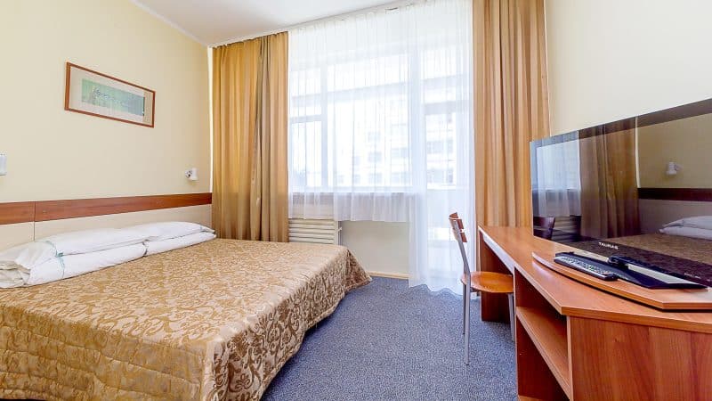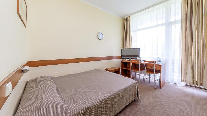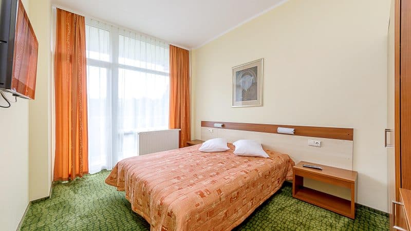 Vieno kambario numeris su 160 cm pločio lova (vieno kambario numeris su dviem 90 cm pločio), balkonu, dušu ir WC. Kambaryje yra: