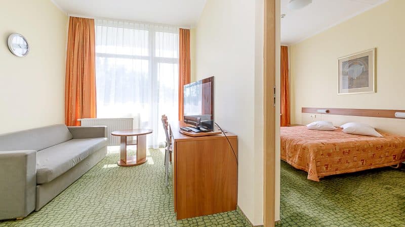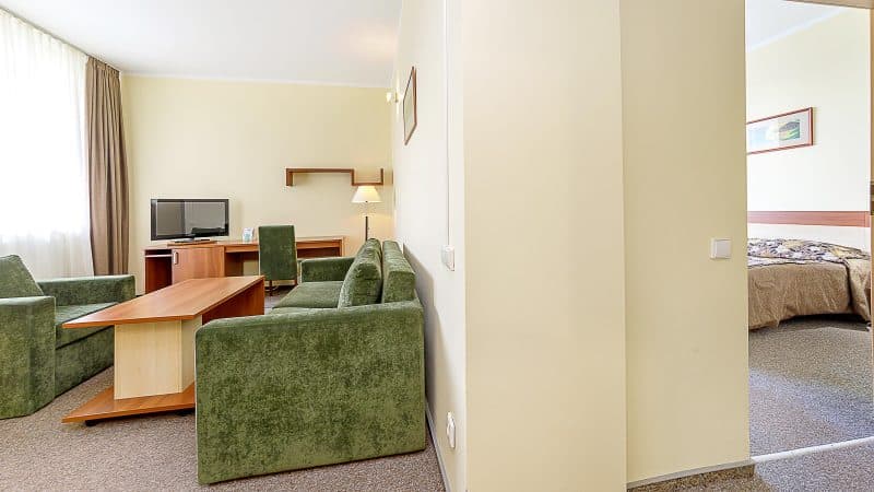 Dviejų kambarių numeris (25-40 kv. m.), miegamasis su 160 cm. pločio lova ir svetainė su išskleidžiama sofa – lova, balkonu, dušu ir WC. Kambaryje yra: